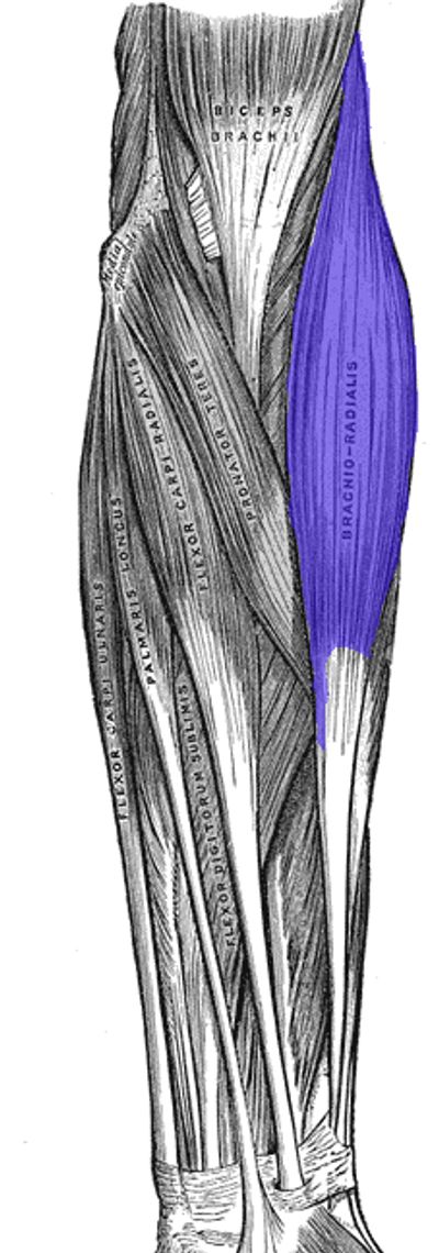 The brachioradialis is a muscle of the forearm that flexes the forearm at the elbow. It is also capable of both pronation (rotate palm downward) and supination (rotate palm upward), depending on the position of the forearm.