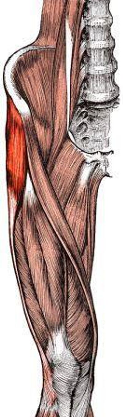 The gluteus maximus is the main extensor muscle of the hip. It is the largest and most of the three gluteal muscles and makes up a large portion of the shape and appearance of each side of the hips. Its thick fleshy mass, in a quadrilateral shape, forms the prominence of the buttocks.