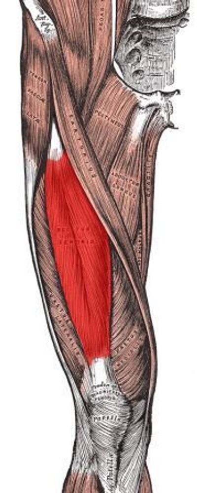 Insertion: Quadriceps tendon (all four quadriceps attach into this tendon, which connects to the knee)