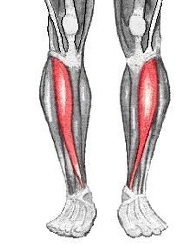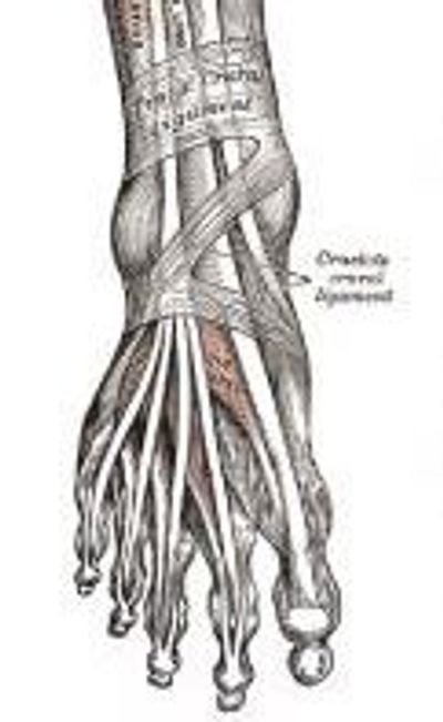 This muscle has a similar function to the tibialis anterior, so if one is tight, the other muscle is usually tight as well. Also, it attaches on the small toes, and it's tendon runs through the shoe lace area.