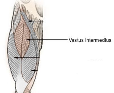 The vastus intermedius arises from the front and lateral surfaces of the body of the femur in its upper two-thirds, sitting under the rectus femoris muscle.